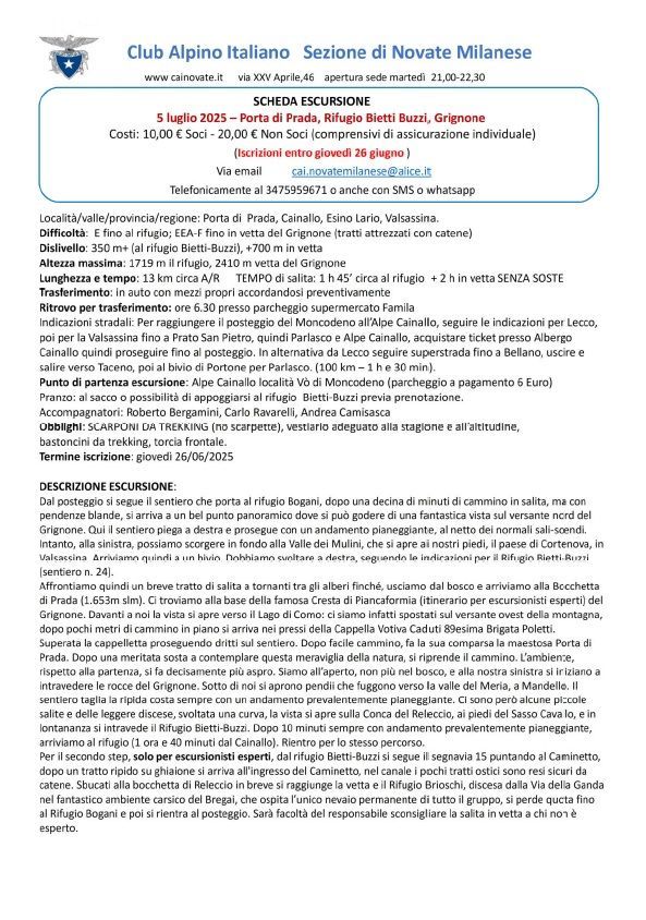 Prossima uscita del CAI novatese il 5 luglio con meta la Porta di Prada sulla Grigna settentrionale..
