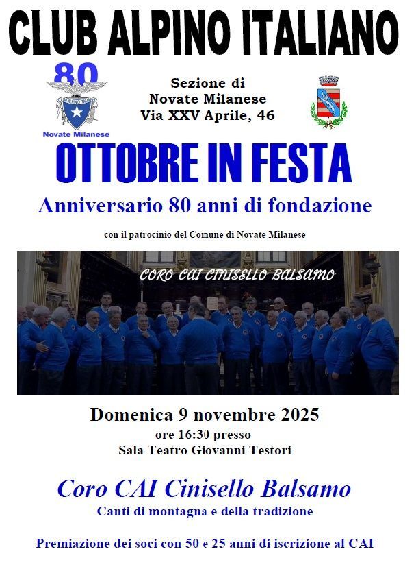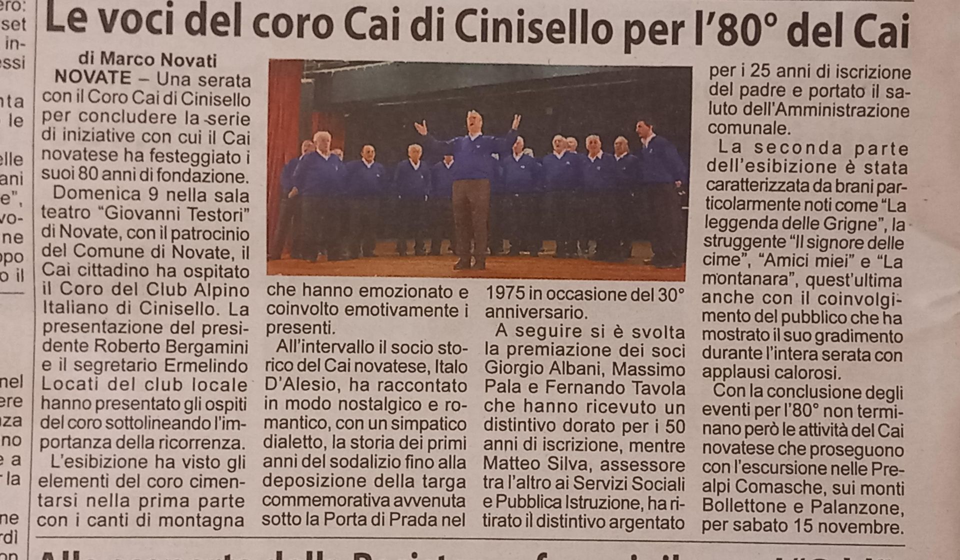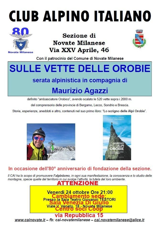 Venerdì 24 ottobre, nella sede del Centro sociale Coop, in via Repubblica,15, nell'ambito delle iniziative per celebrare l'80° anniversario di fondazione della sezione, con il patrocinio del Comune, il CAI novatese ha ospitato l'alpinista Maurizio Agazzi, autore del libro "Lo scrigno delle Alpi Orobie" (Editrice "Oros).