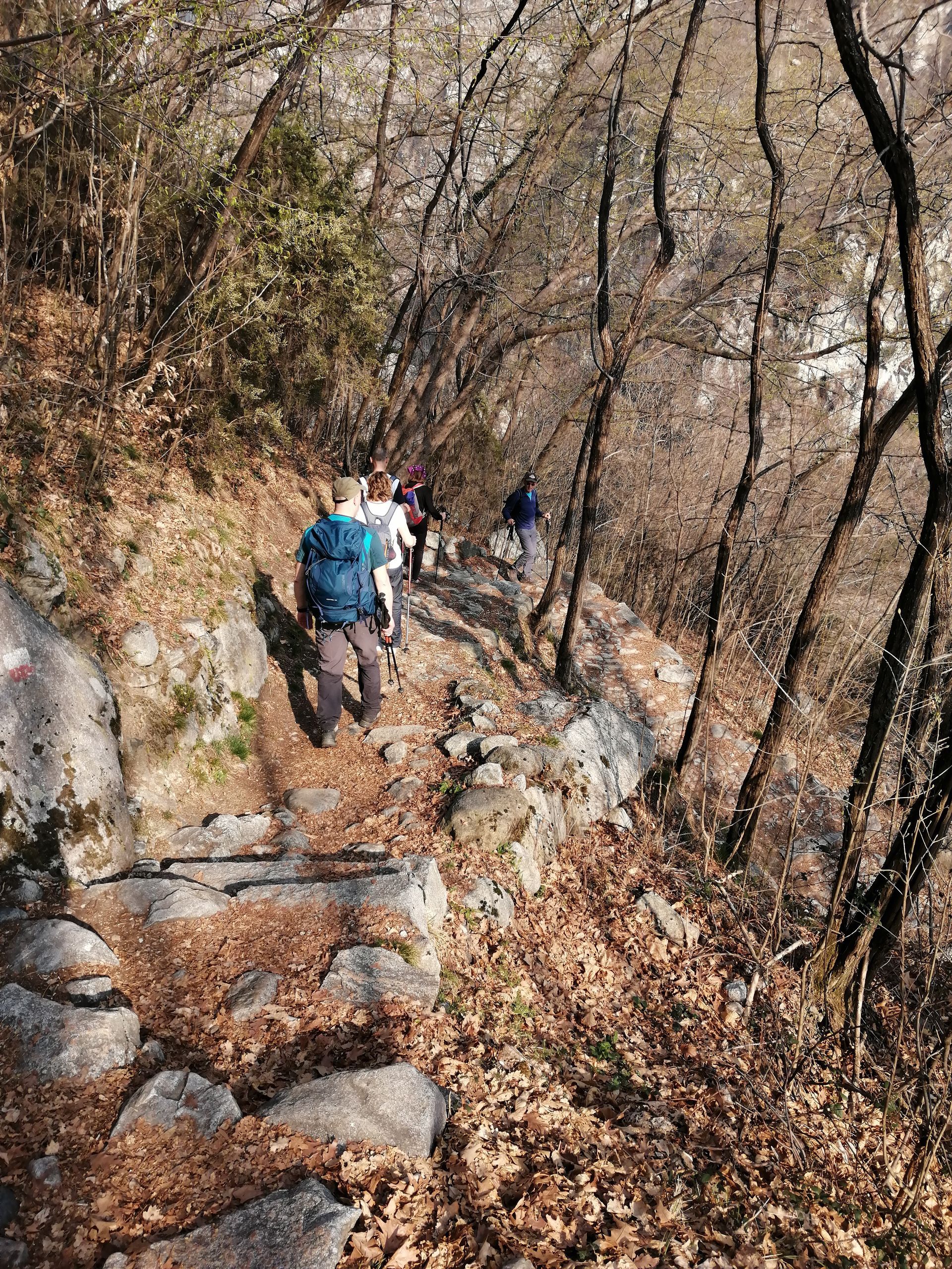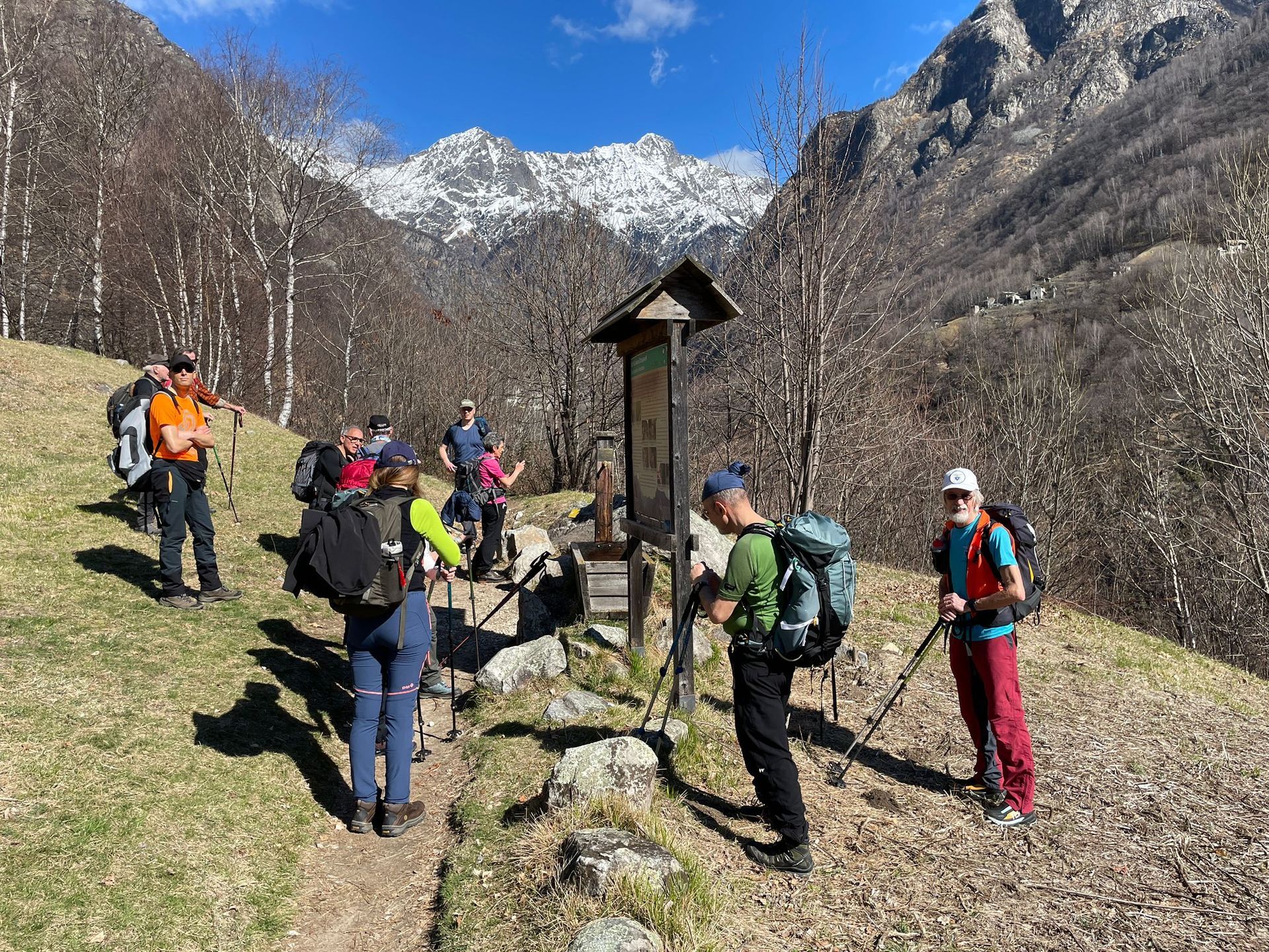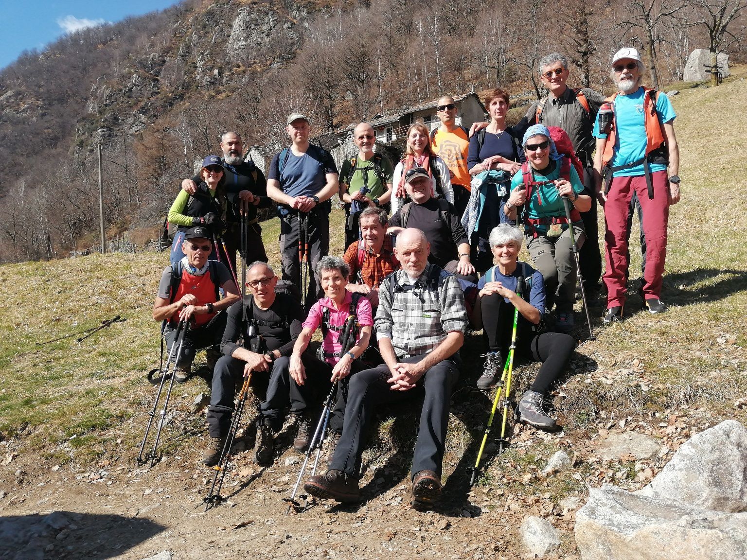 Raggiunto da Santino il posteggio presso la frazione di Ruspesso, il gruppo, calzati gli scarponi e zaino in spalla, in pochi minuti è arrivato al rifugio Fantoli all'Alpe Ompio (mt.1000). Alle spalle del rifugio ha proseguito in salita, a tratti impegnativa, fino al valico della Croce (mt.1100) e poi fino al bivio che conduce alle Caserecce, con un ampio panorama sulla bassa Val Grande.