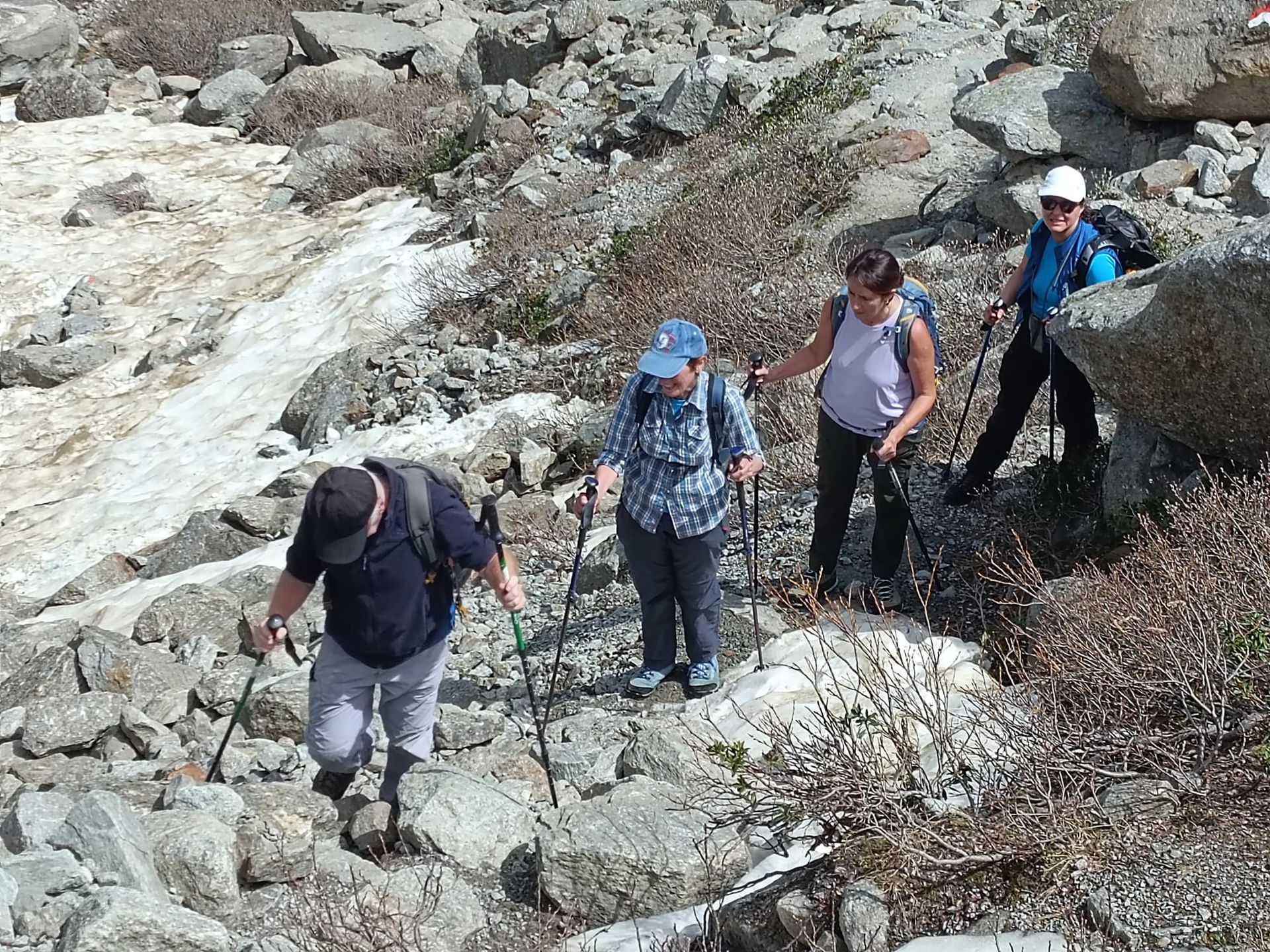 Giunti in cima alla montagnola, dopo un breve tratto in discesa ecco finalmente il lago delle Locce; uno spettacolo assoluto. Foto infinite e colazione al sacco per il gruppo, ora ricompattato, incantato davanti al panorama,in religioso silenzio per ascoltare il rumore sordo del ghiacciaio che si crepa e rilascia i suoi detriti.